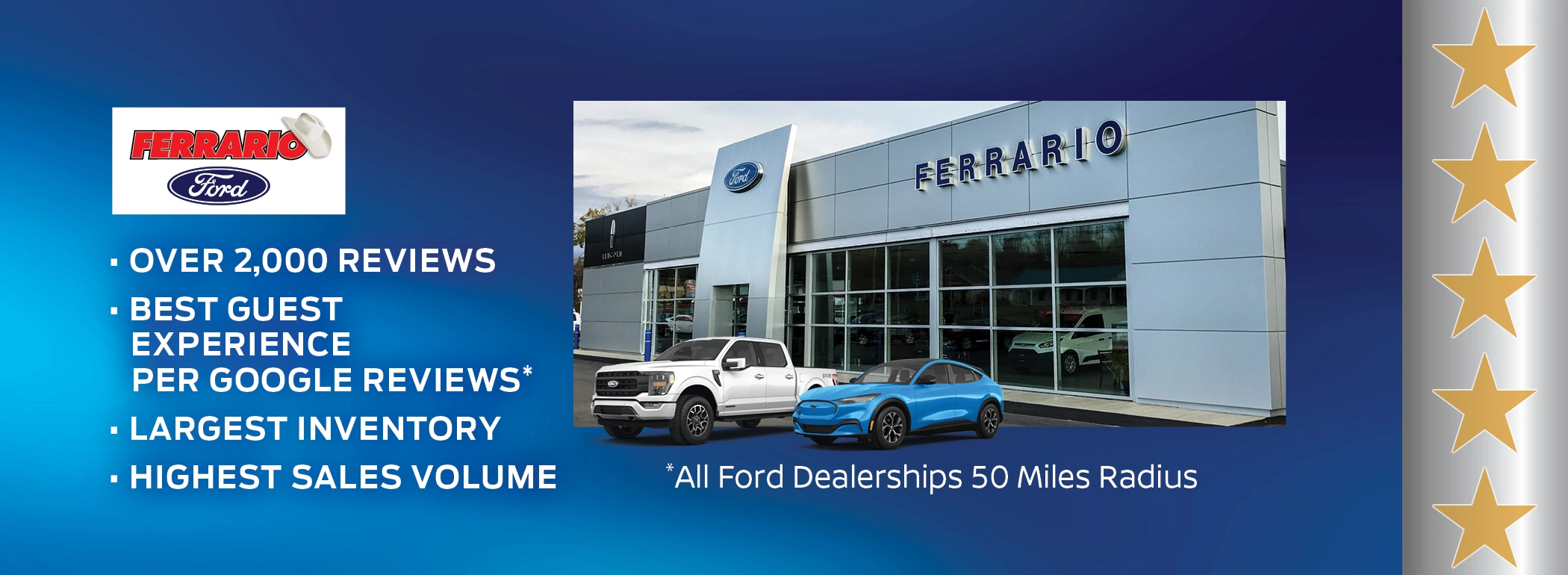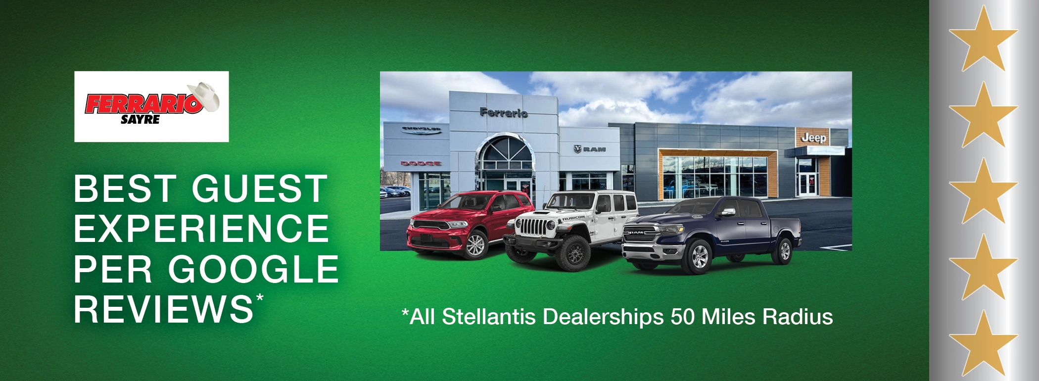 We strive everyday to make your vehicle shopping or service experience the best it can be. That’s what we are proud to say we are the best in a 50-mile radius above all others in our Google Reviews. Whether you are shopping for a car, truck or SUV we have you covered with one of our distinctive Brands. Ford-Chrysler-Dodge-Jeep-RAM-Nissan. Looking for a work truck, look no further than Ferrario Commercial Trucks for your next purchase. Searching for an Electric Vehicle? All our Brands have choices for you to shop.